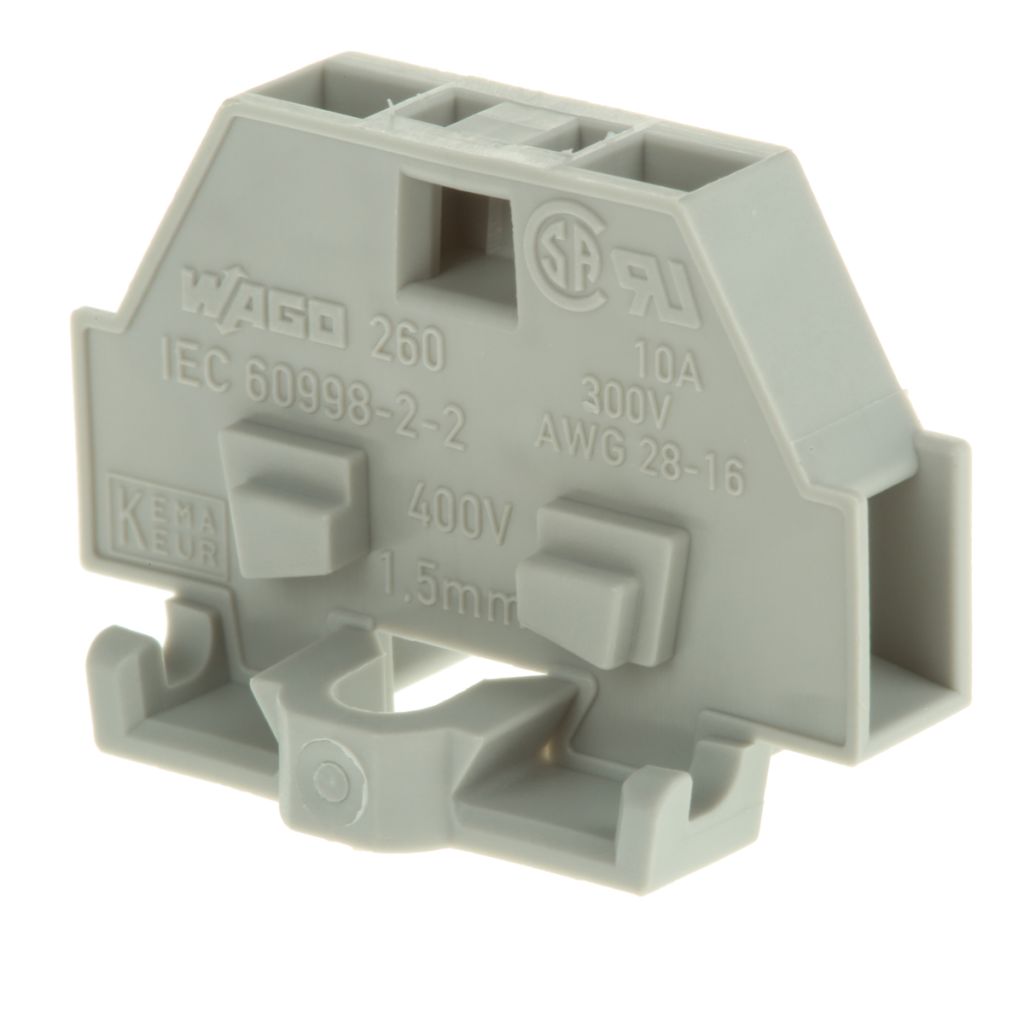 | Product description | Wago Grey 260 Standard Din Rail Terminal, 28 → 16 AWG, 1.5mm², 400 V |