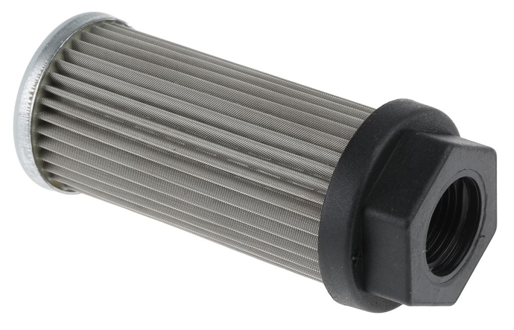 One piece suction strainer for use in hydraulic reservoirs and tanks. These elements can be installed directly onto the pump suction line and should always be below the minimum fluid level of the tank. The end caps, inner support cylinder and filter media are epoxy bonded to form a one piece contrsuction.