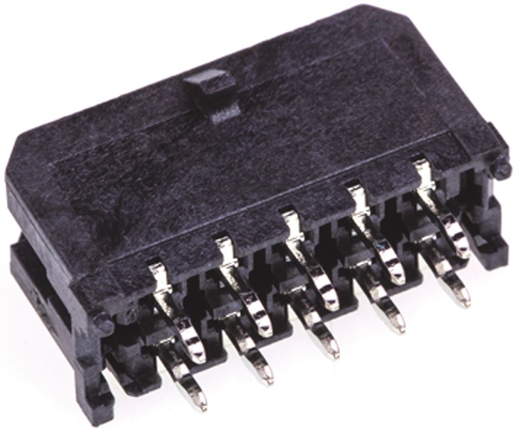Micro-Fit 3.0 3mm pitch wire to board dual row PCB headers which form part of a compact power connector system providing a low to mid-range power distribution solution. With the ability to carry up to 5A of current, Micro-Fit 3.0 connectors have one of the highest current carrying abilities in the smallest footprints available. These Micro-Fit 3.0 PCB headers incorporate positive latching in the form of a locking ramp on the housing for secure mating and to prevent accidental disconnection. The housings are made of high-temperature UL 94V-0 Liquid Crystal Polymer that can withstand temperatures of up to 265°C during the IR reflow soldering process. The through hole mounting versions of these Micro-Fit 3.0 headers are also SMT compatible which means a reduction in process requirements and costs. To help position and align these Micro-Fit 3.0 headers to the PCB board, PCB polarising pegs are incorporated into the connector design. part numbers ending in xx12, xx13 and xx14 also feature kinked solder legs for additional PCB retention. The contacts of these Micro-Fit 3.0 headers are fully isolated within the housings to reduce arcing. Tin or a choice of two thicknesses of gold contact platings are available to keep down costs.