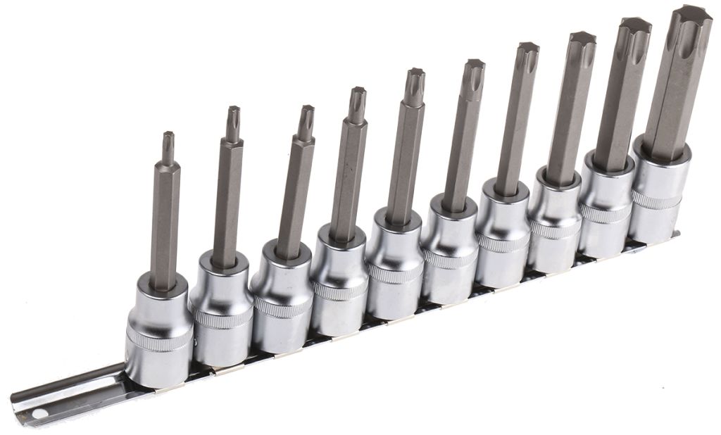 Hardened and tempered Torx (or Star) bit set for heavy duty use. Each set is supplied complete on a rail retaining bar which can be wall mounted or used within a roller cabinet storage box.