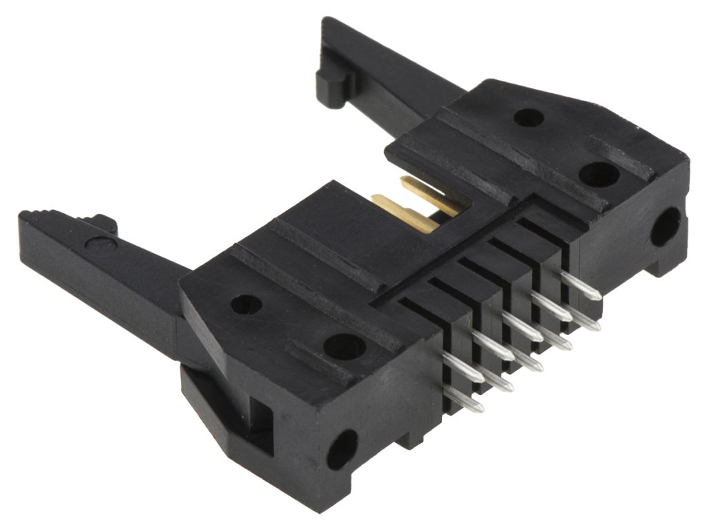 AMP-LATCH universal ejection style PCB header connectors with a 2.54 x 2.54 mm centreline. These AMP-LATCH ejection headers have military, centre and dual polarization for accurate mating. Versions of these AMP-LATCH universal headers feature ejector latches which enable a secure connection to and easy removal from the mating IDC ribbon cable receptacle connectors. These AMP-LATCH universal ribbon cable header connectors are available without latches or with a long or short latch style