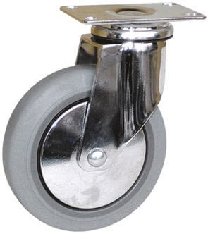 Low duty chrome castors with a non-marking grey thermoplastic rubber tyre fitted to the grey polypropylene copolymer wheel.