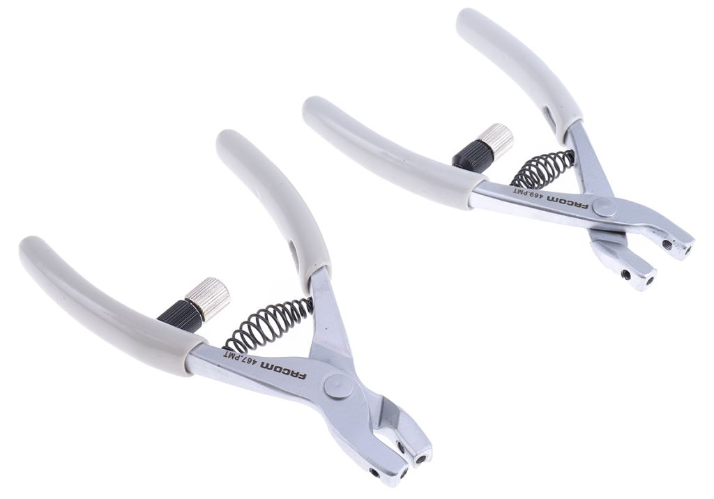 Pliers fitted with return spring and screw stop to prevent circlip distortion and ensure precision of compression or expansion