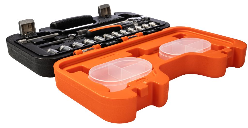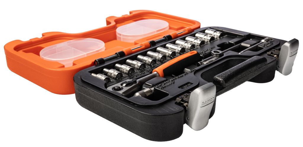 High quality S-160 socket set from Bahco. This 1/4 in square drive socket set is supplied complete with 16 piece socket and bits. The socket set offers the most popular sizes sockets, a selections of bits and extensions plus a ratchet offering multiple positions. The high performance chrome vanadium steel sockets, ratchet and screwdriver with matt finish will give the user years of service. The soft grip ratchet in the set also has a quick release button making it easy to use and more productive for the user. Keeping your tools safe and protected, this kit comes in a high density polythene case.