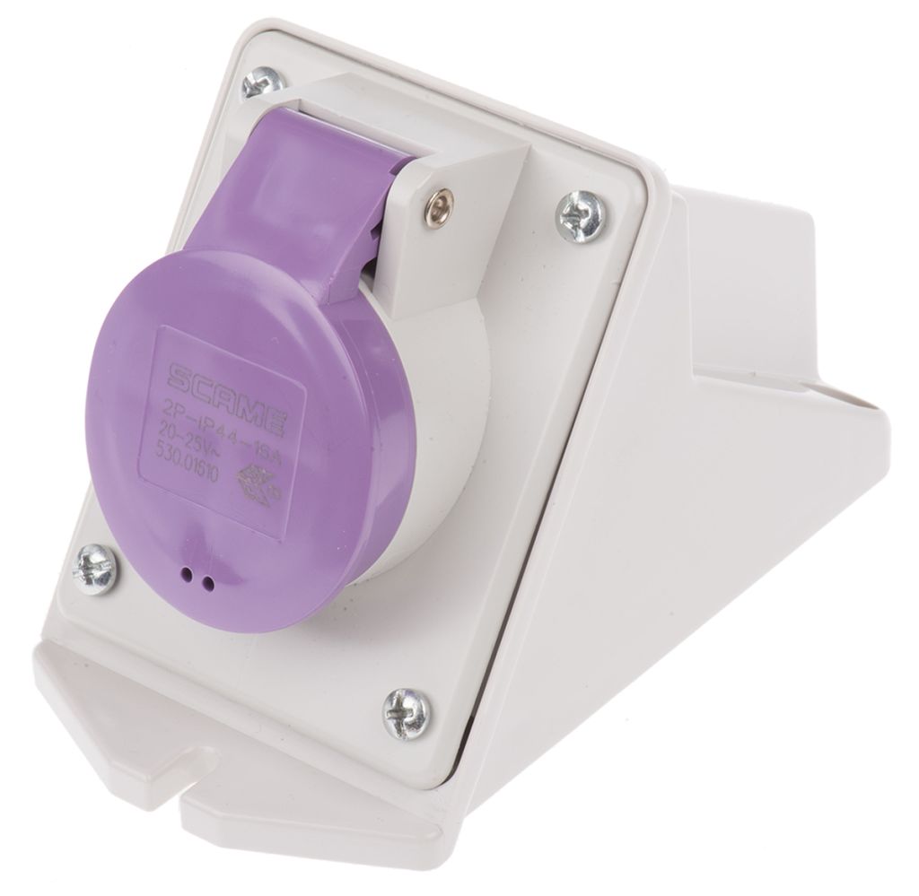| Product description | Scame IP44 Purple Wall Mount 2P Right Angle Industrial Power Socket, Rated At 16A, 20 → 25 V |