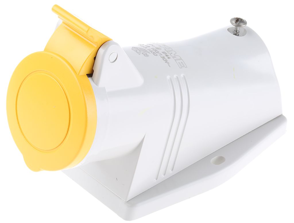 Product description Scame IP44 Yellow Wall Mount 2P+E Right Angle Industrial Power Socket, Rated At 16A, 110.0 V