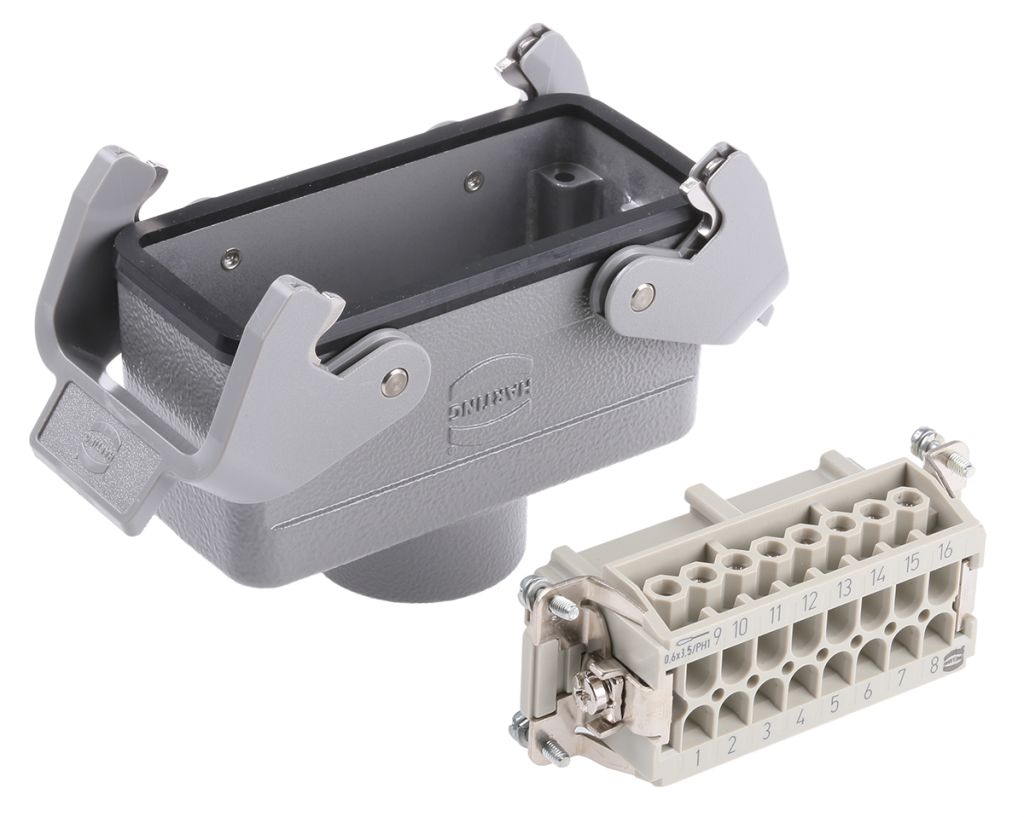 Two-part packs that provide towards the assembly of Harting Han E® metal-bodied cable plugs, cable coupling hoods, bulkhead/panel mounting housings, and surface mounting housing sockets.,Screw terminal connection.,Each pack contains a hood or housing, and male or female insert.,All the individual components are available separately from within the relevant Ranges of inserts, hoods, and housings.,All are rated at 450 – 500V, and 16A,Suitable cable glands are available separately