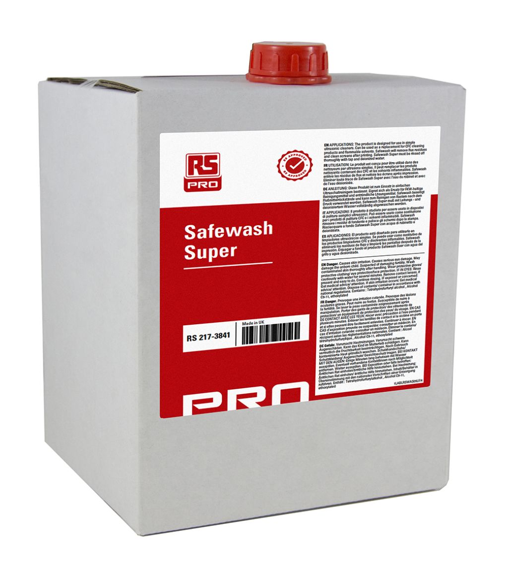 Safewash super 2000 cleaning fluid from RS PRO. This superior flux removal zero ozone depletion aqueous cleaner is to be used in ultrasonic batch and in line bulk cleaning of PCB's, screen printers, electrical equipment and general degreasing. The safewash meets the requirements of both military and commercial electronics manufacturing companies across the world making this the perfect cleaning fluid for your applications. This precision cleaner is very reliable and highly recommended.