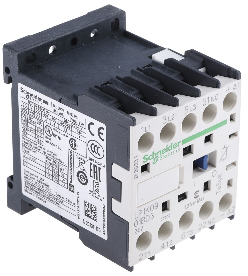 | Product description | Schneider Electric TeSys K LP1K 3 Pole Contactor - 9 A, 24 V dc Coil, 3NO |