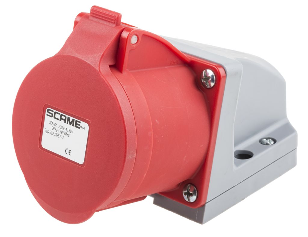 | Product description | Scame, Optima IP44 Red Wall Mount 6P+E Right Angle Industrial Power Socket, Rated At 32A, 415.0 V |
