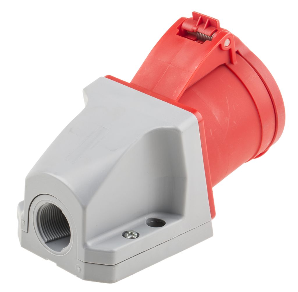 Red 6P+E, 6h, IP44 Rated Female Angled Panel Mount Socket, 16A, and 32A, Optima-Seven