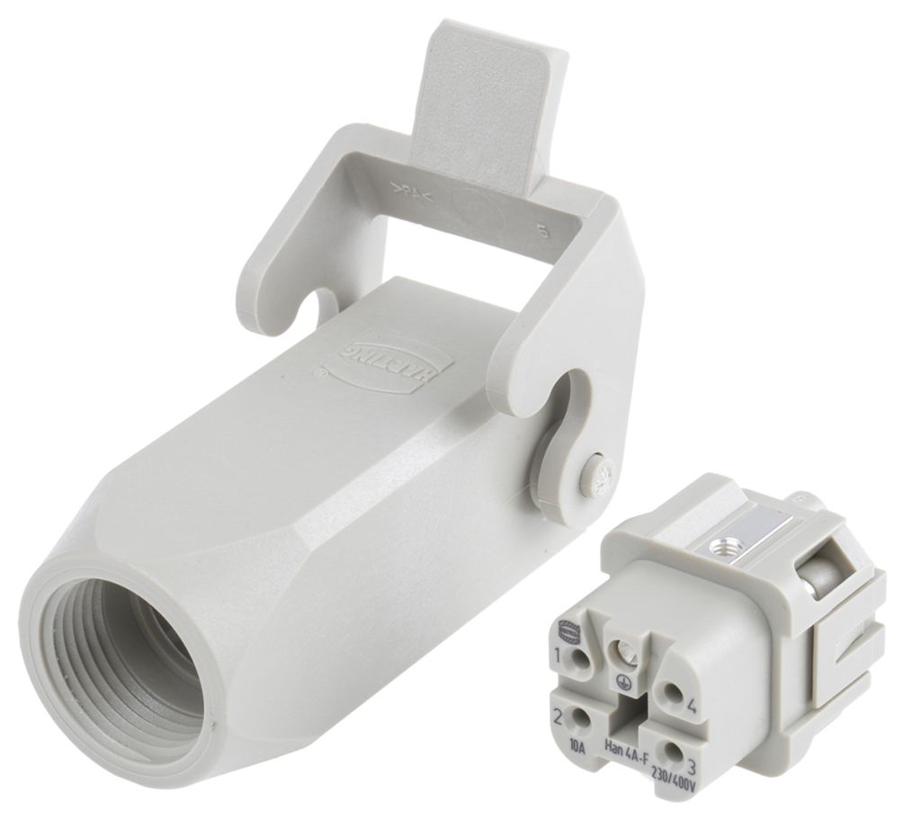 Two-part packs that provide towards the assembly of Harting Han A® cable plugs, cable coupling hoods, and bulkhead/panel mounting housings. Screw terminal connection. Each pack contains a hood or housing, and a male or female insert. All the individual components are available separately from within the relevant Ranges of inserts, hoods and housings. Suitable cable glands are available separately – see stock nos. 390-088, 444-2600 and range. Available in plastic and metal bodied types.