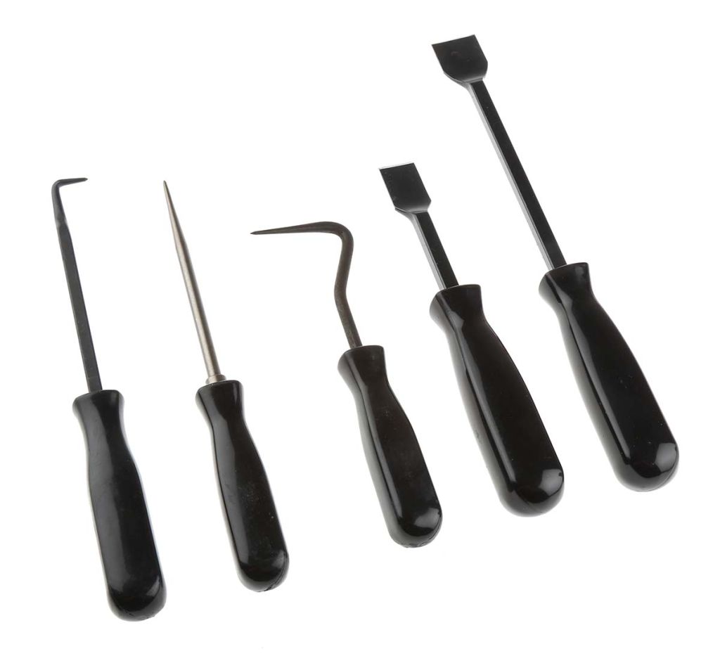 • The type of tools in this kit are: A scratch awl, cotter pin puller, radiator hose remover and a couple of different sized multi-purpose scrapers