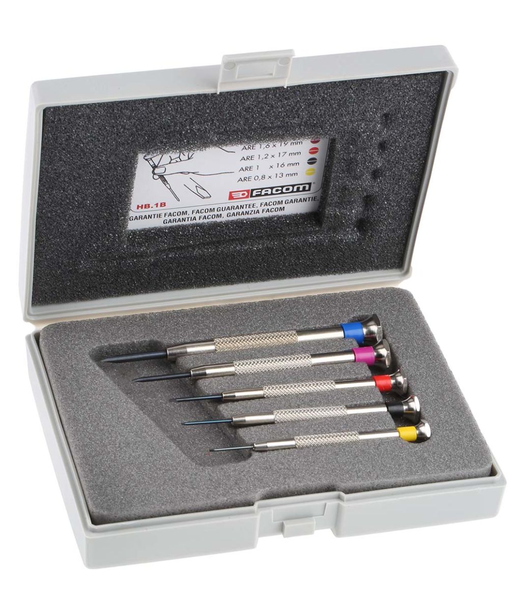 Facom watchmaker’s miniature screwdriver set comes with 5 or 6 piece screwdrivers to fit slotted, hex and phillips head screws. These screwdrivers have burnished hardened steel shafts, chrome finish bodies and revolving colour coded heads. The colour coded head allows you to identify the size of the screwdriver much easily.