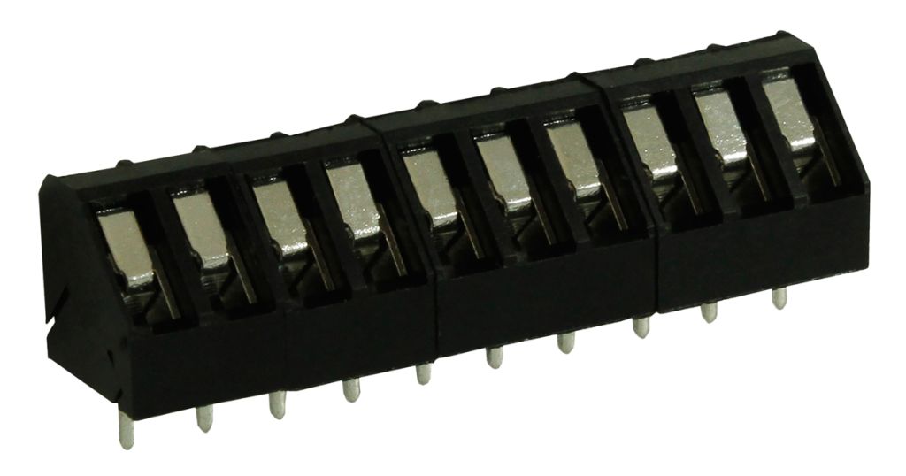 5 mm pitch PCB terminal blocks with 45° angled design, professional rising clamp terminals and black UL94-V0 flame retardant PA66 housings. These 5 mm low profile terminal blocks have M2.5 nickel plated steel screws and accept a size range of 0.2 - 3.3 mm2 (24-12 AWG).