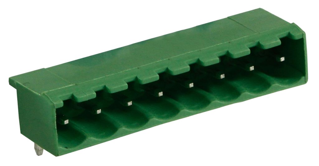5mm pitch horizontal mount PCB terminal block headers made from green UL94-V0 flame retardant PA with a closed end design and polarised mouldings. These 5mm pluggable PCB terminal block headers have guided pin alignment and mate with 5mm pitch female terminal block plug connectors, see stock number 897-1159 typically.