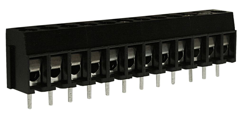 5mm pitch standard profile PCB teminal blocks with screw terminals and black UL94-V0 flame retardant PA66 housings. These 5mm standard profile terminal blocks have stainless steel wire protectors, M3 nickel plated stainless steel screws, guided pin alignment and accept a wire size range of 0.3-2mm2 (22-14 AWG).