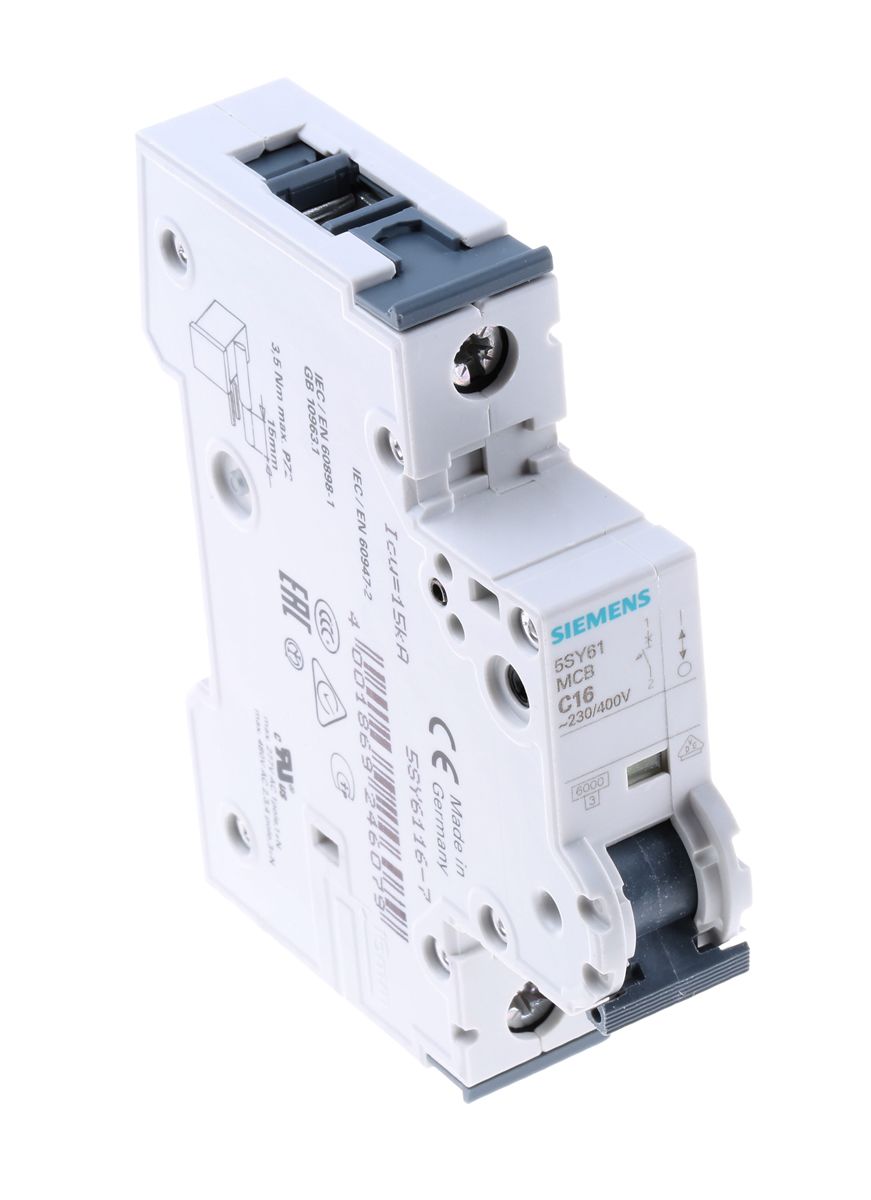 Siemens Sentron 16A MCB Mini Circuit Breaker, 1P Curve C, Breaking Capacity 6 kA, 230V