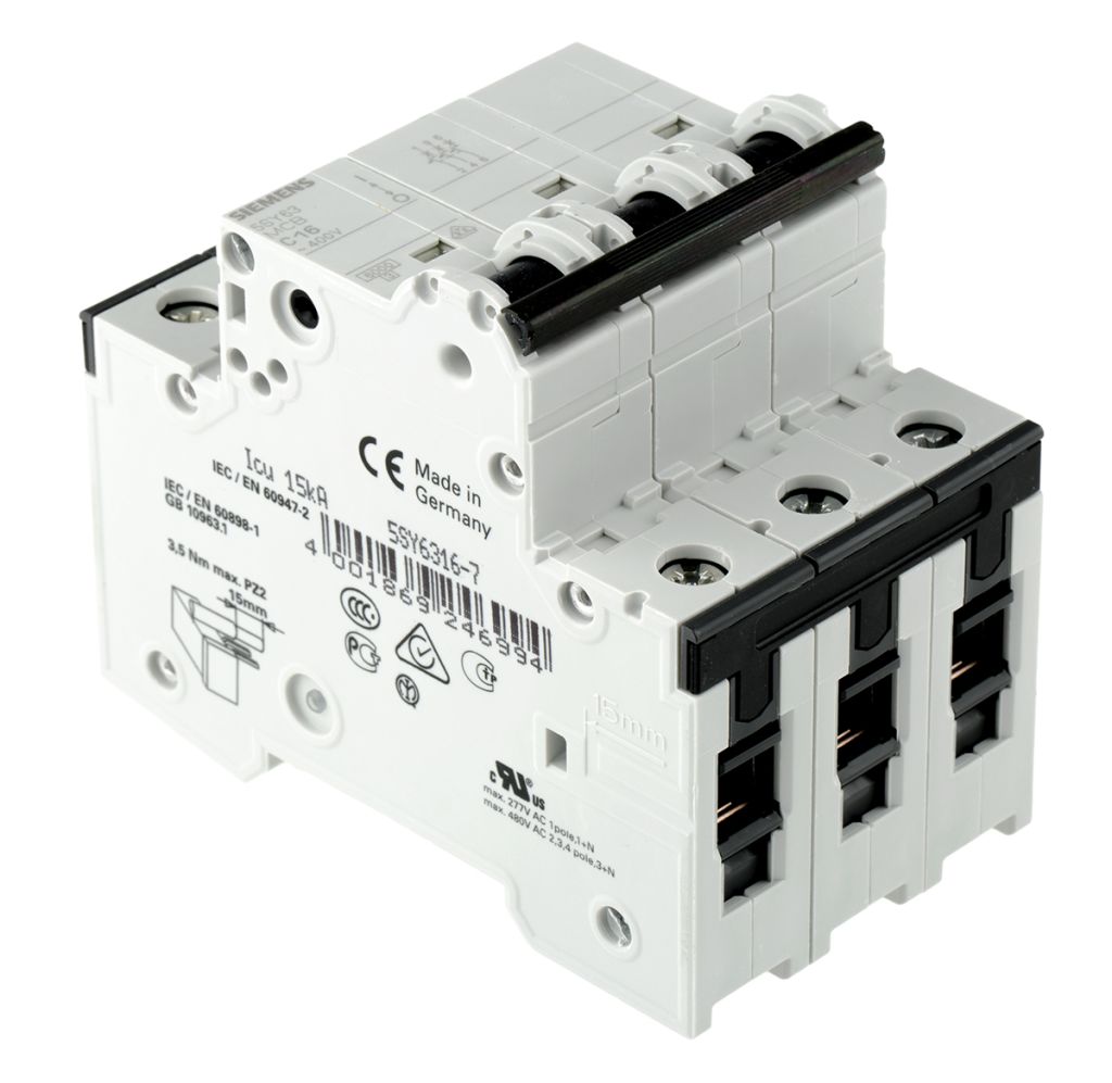 Siemens Sentron 16A MCB Mini Circuit Breaker, 3P Curve C, Breaking Capacity 6 kA, 400V