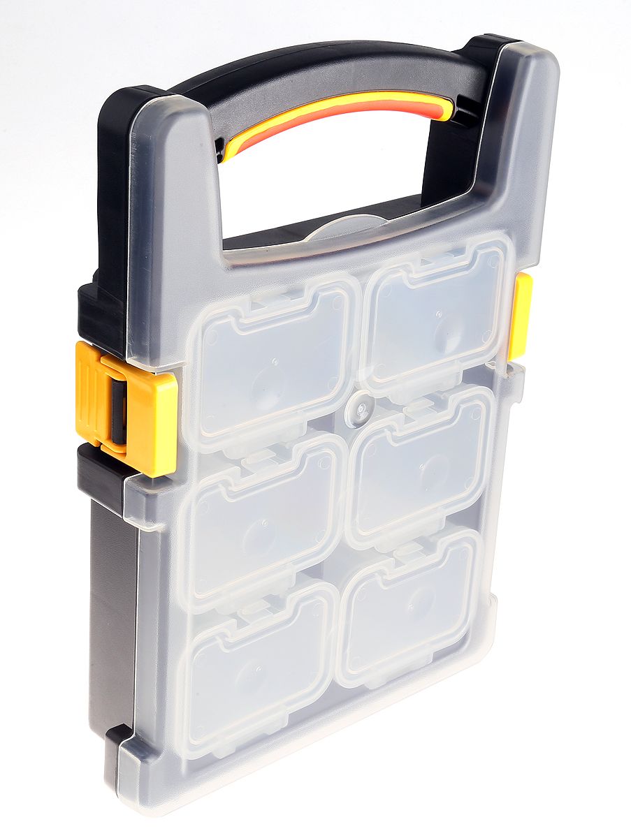 Professional polypropylene assortment case with hinged clear lid and lock. Suitable for storing small parts.