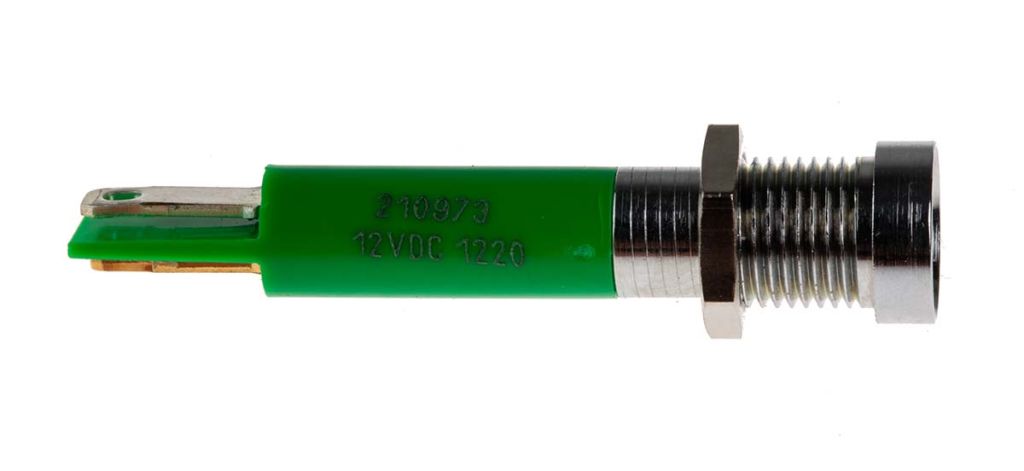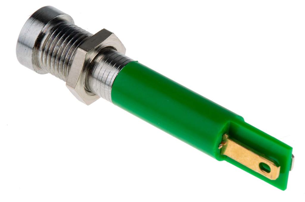 | Product description | RS PRO Green Indicator, 12V dc, 8mm Mounting Hole Size, Solder Tab Termination |