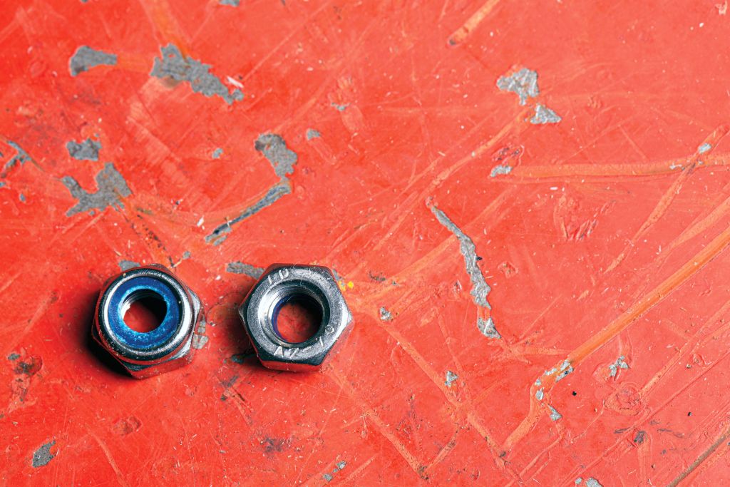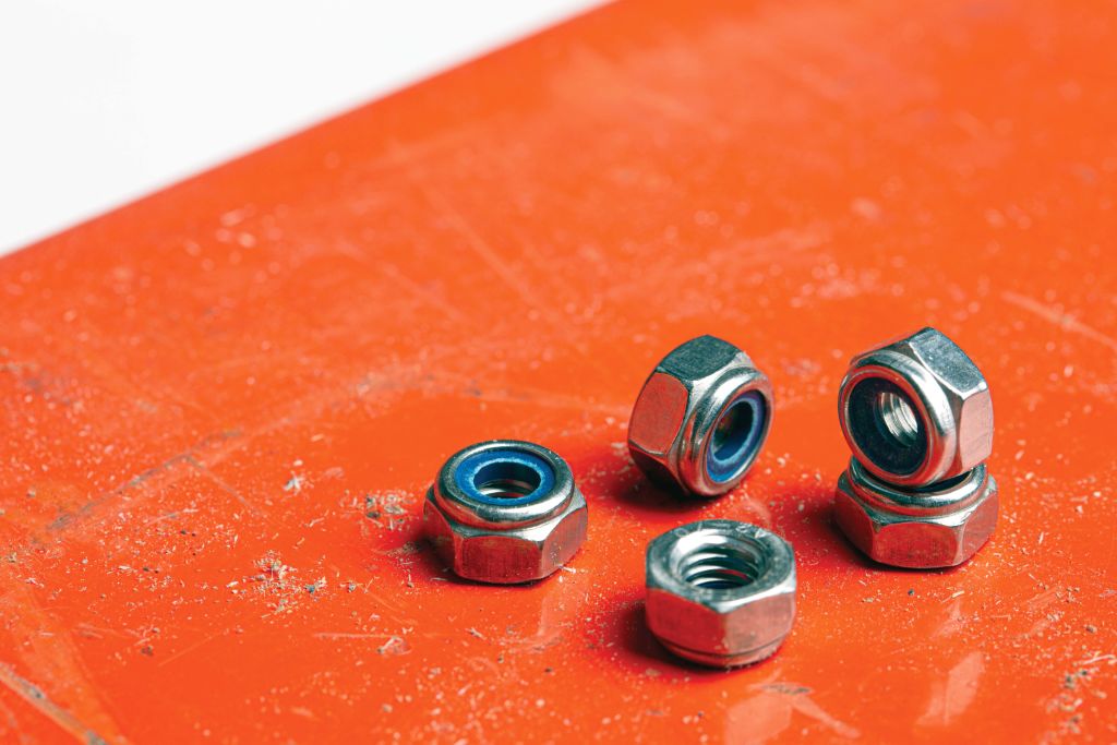 Unlike conventional fasteners, lock nuts, sometimes known as self-locking nuts, contain a plastic insert that deforms to the thread of the fastener and prevents loosening without the aid lock threading adhesive. As such, they are often used where security in fastening is required. They are useful when joining soft materials such as wood and plastics where high surface pressure might damage the material, or when there is a short clamp load. However, their principal advantage is in applications where there is a high degree of vibration. Locking nuts resist loosening over time in dynamic load conditions. As such they are often used in;