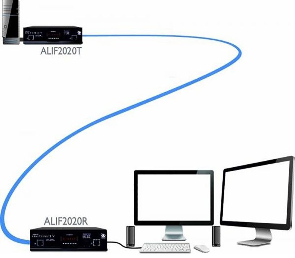 ALIF1000 supports one single link DVI video stream, plus microphone, speakers and up to four USB peripherals. ALIF1000 units are linked using Gigabit