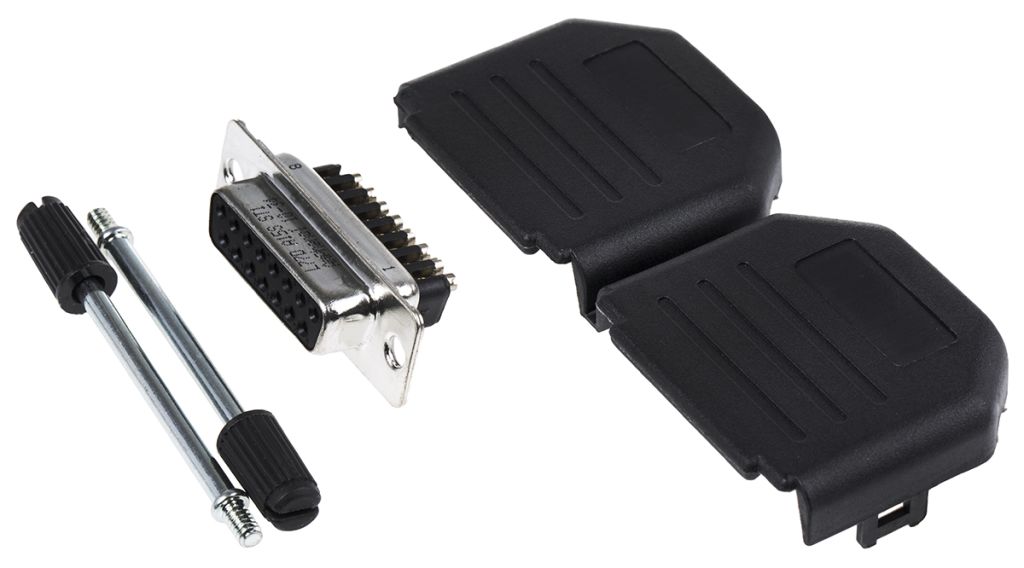 15 and 25-way D-Sub connectors with direct screw connection supplied as a kit, including hood and screws