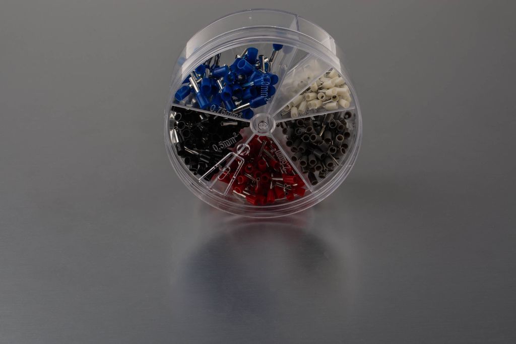 From RS PRO a handy crimp terminal kit containing an assortment of 400 high-quality DIN 46228 standard colour coded insulated bootlace ferrules (also known as cord end ferrules or wire end ferrules). These wire ferrules range from size 0.5 mm² through to 2.5 mm² and are stored in separate compartments within a clear circular box for easy selection. This kit is portable and ensures you are equipped with all the necessary terminal sizes when it comes to terminating conductors wherever you are working.