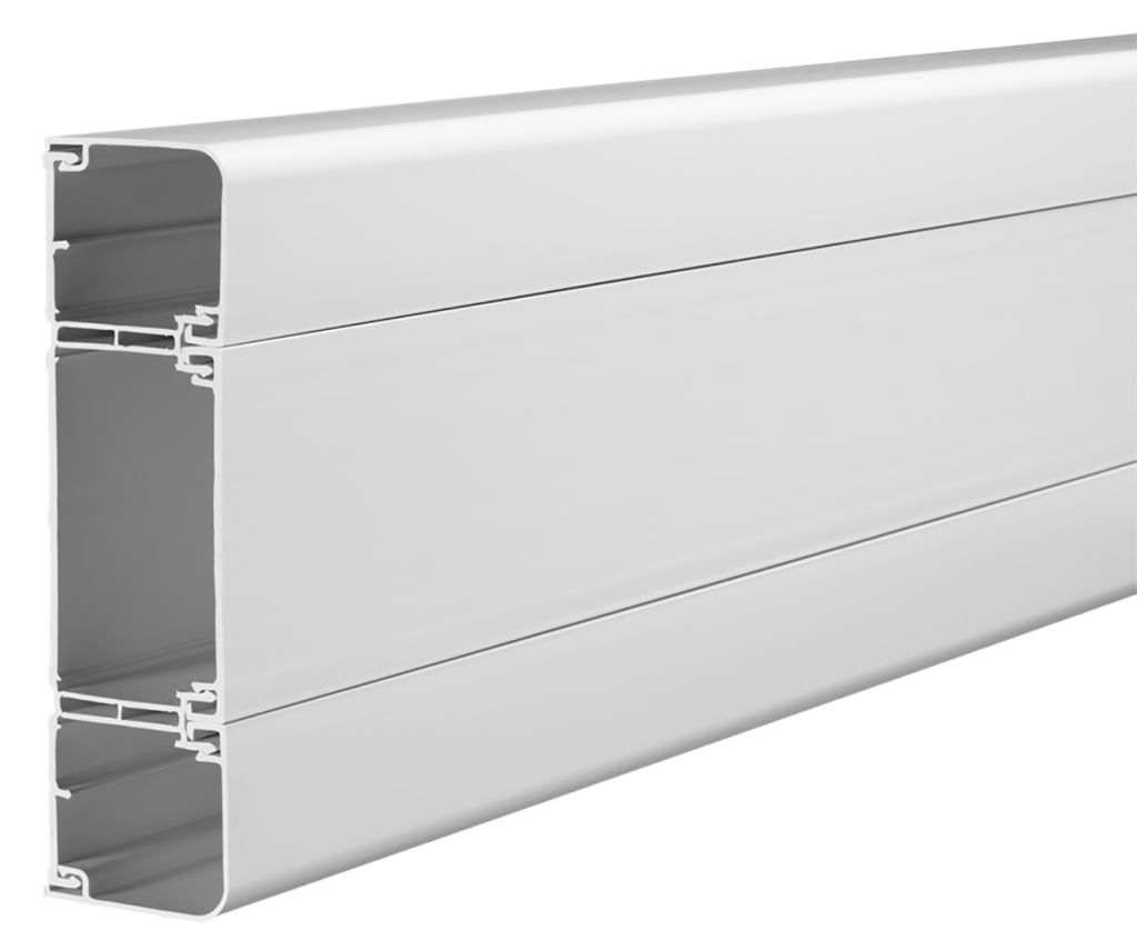 Installation of cables in Cableline white PVC wall mounted dado and skirting trunking is an effective means of facilitating power and communications distribution. Cableline three compartment trunking is an all insulated cable management system with each compartment having its own clip-on lid to allow for complete segregation of power, data and telecommunications circuits. This along with a dedicated selection of Fittings make it a versatile readily adaptable system to meet unusual site requirements.