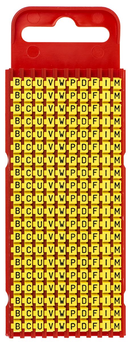 | Product description | HellermannTyton WIC1 Snap On Cable Markers, Pre-printed "B; C; D; F; I; M; P; U; V; W", Yellow, 2 → 2.8mm Dia. |
