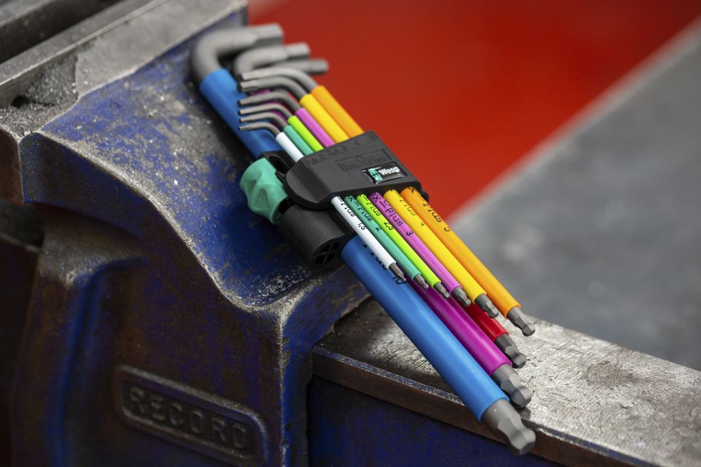 Wera 9 piece, L shaped hex-plus set that has been designed to ensure a larger contact surface inside the screw recess, reducing notching effect and enabling 20 % more torque transfer.