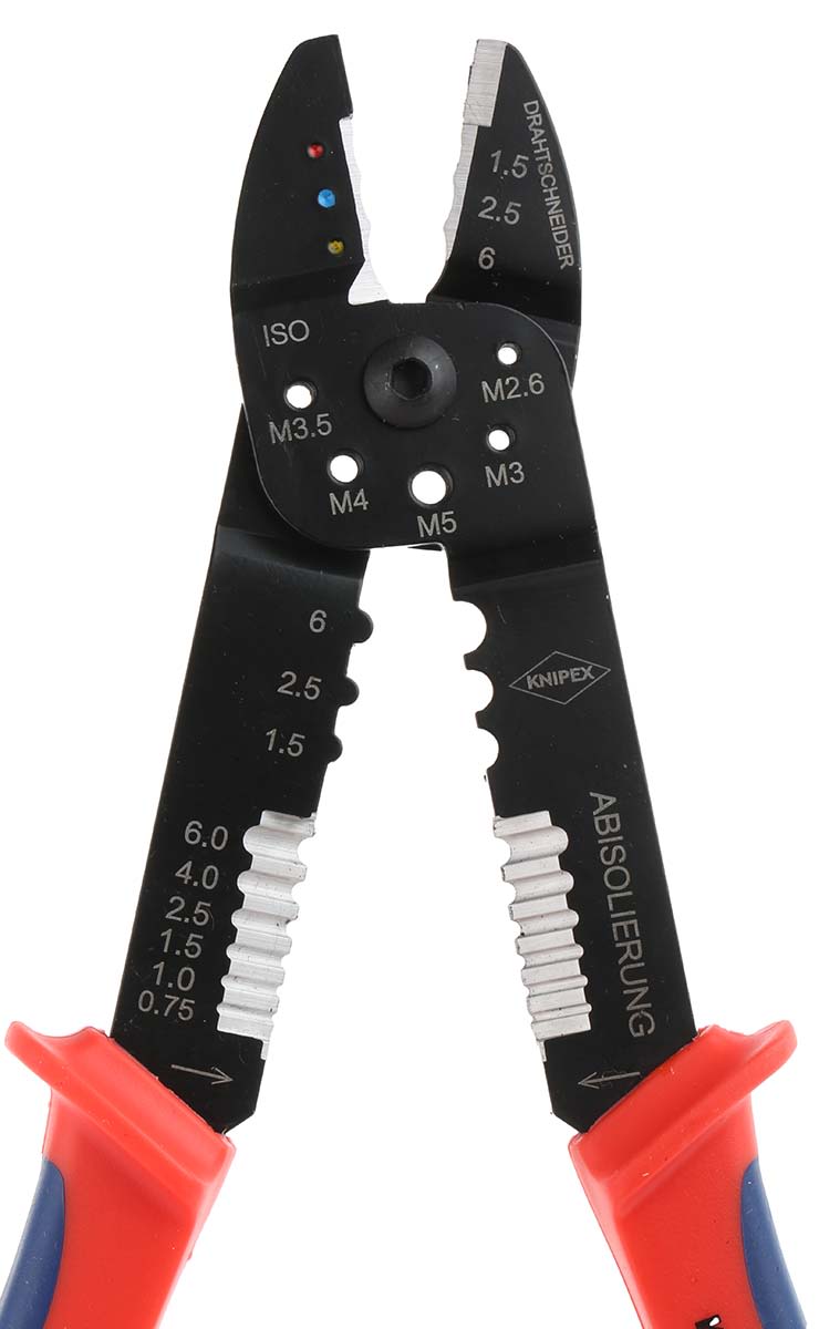 The Knipex crimping pliers are designed for cutting, stripping wire, crimping insulated terminals, plug connectors and non-insulated open plug-type connectors. The pliers have a bolted joint for higher stability and even movement. Forged from a special steel, for added strength and durability.