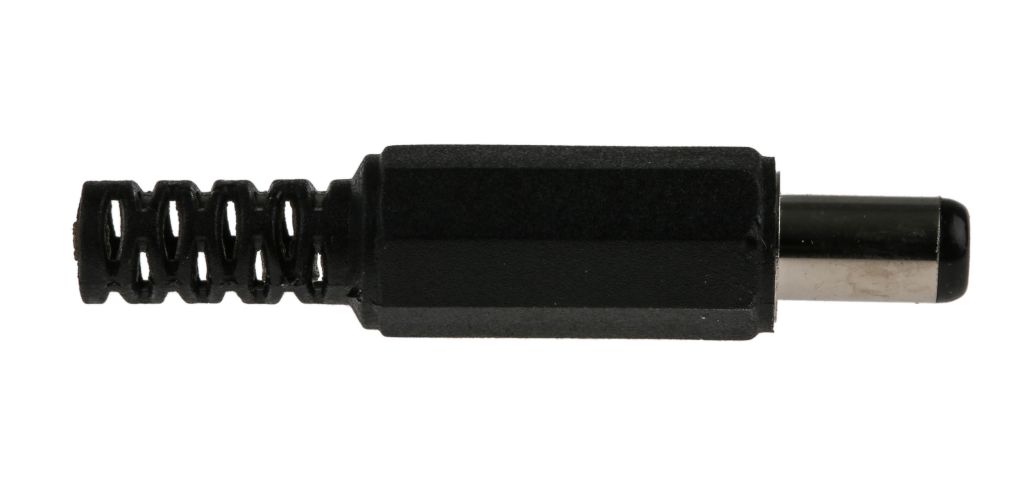 The DC connector plug is has a sturdy ABS body and a nickel-plated brass contact for a dependable connection. The connector plug also features a crimp strain relief for securing the cable insulation, meaning this connector is securely terminated to the wire. This DC power connector is ideal for powering small appliances such as portable radios.