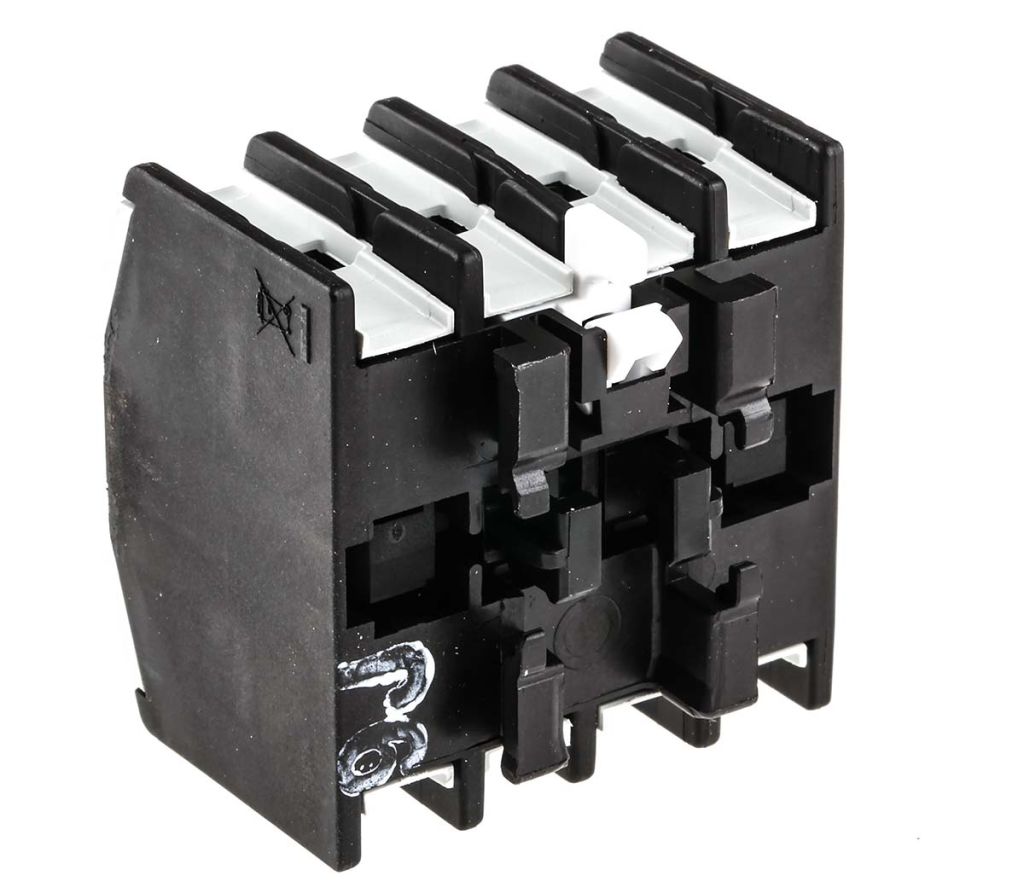 An Auxiliary Contact block, or aux contact, is an electromechanical device that is mounted typically to contactors. They are physically connected to the contactor, with simultaneous activation and deactivation applying to both the contact block and the contactor at the same time.