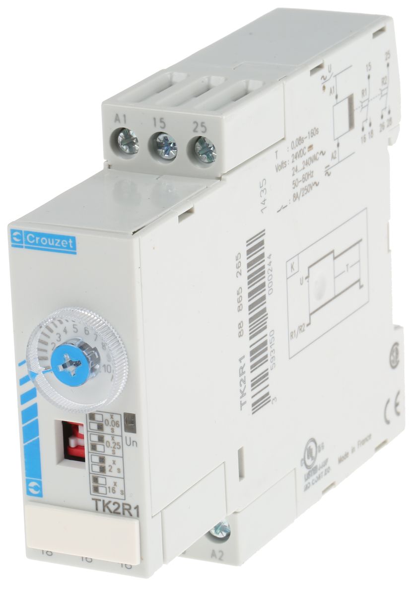 | Product description | Crouzet DPDT Timer Relay, OFF Delay, 24 V dc, 24 → 240V ac 0.6 → 160s, DIN Rail Mount |