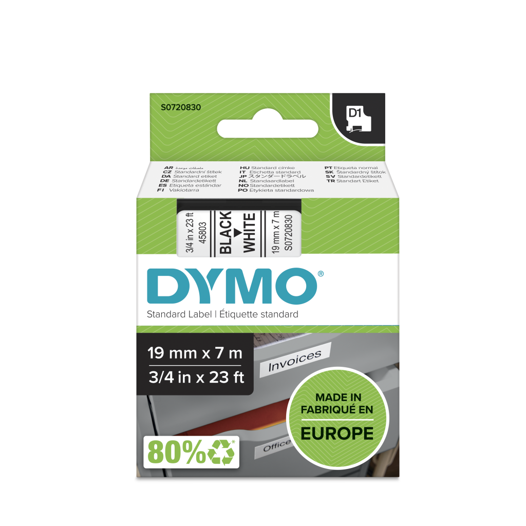 | Product description | Dymo Black on White Label Printer Tape, 19 mm Width, 7 m Length |