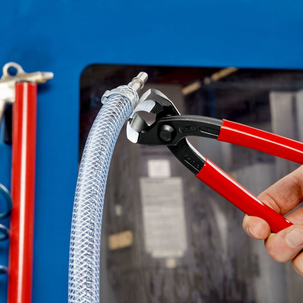 The Knipex ear clamp pincers are suitable for the installation or removal of ear type clamps that secure pneumatic and hydraulic industrial hose fittings. The slim head allows good access for hard to reach areas. Forged from a high grade of special tool steel, oil hardened for added strength and durability.