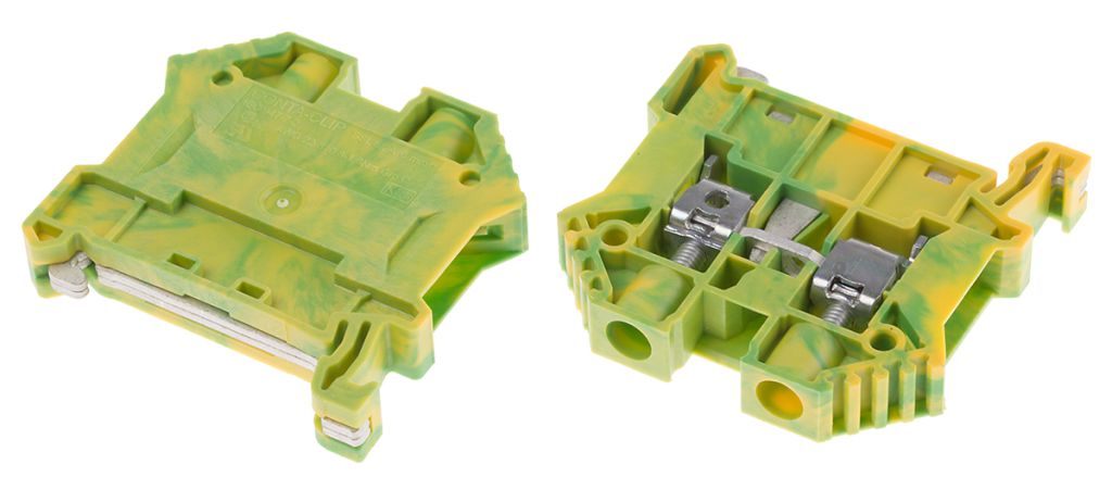 A range of standard feed through DIN Rail terminals with an easy to operate screw connection mechanism that can connect solid and flexible wires, with or without wire-end ferrules. The pluggable insulated cross connection system allows for time saving and cost effective distribution of potentials in different terminal blocks compared to a screw cross connection system. A benefit of this improved system is that adjacent terminals of two different sizes can be cross connected. The 2 cross connection channels allow for an infinite number of terminals to be daisy chained. The earth terminals can be clipped on to the DIN rail without the need for screws. This range of standard terminals has an improved upper temperature range of 120°C. The screw head of the standard terminals is completely mounted into the body so that the metal parts cannot slip out when tightening the screw of the terminal.