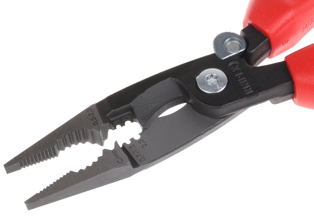 Multifunctional, professional pliers ideal for electrical installation work. 6 functions in one tool, gripping, bending, deburring, cutting, crimping and stripping. Locking lever keeps cutting edges closed, however all other functions remain active.