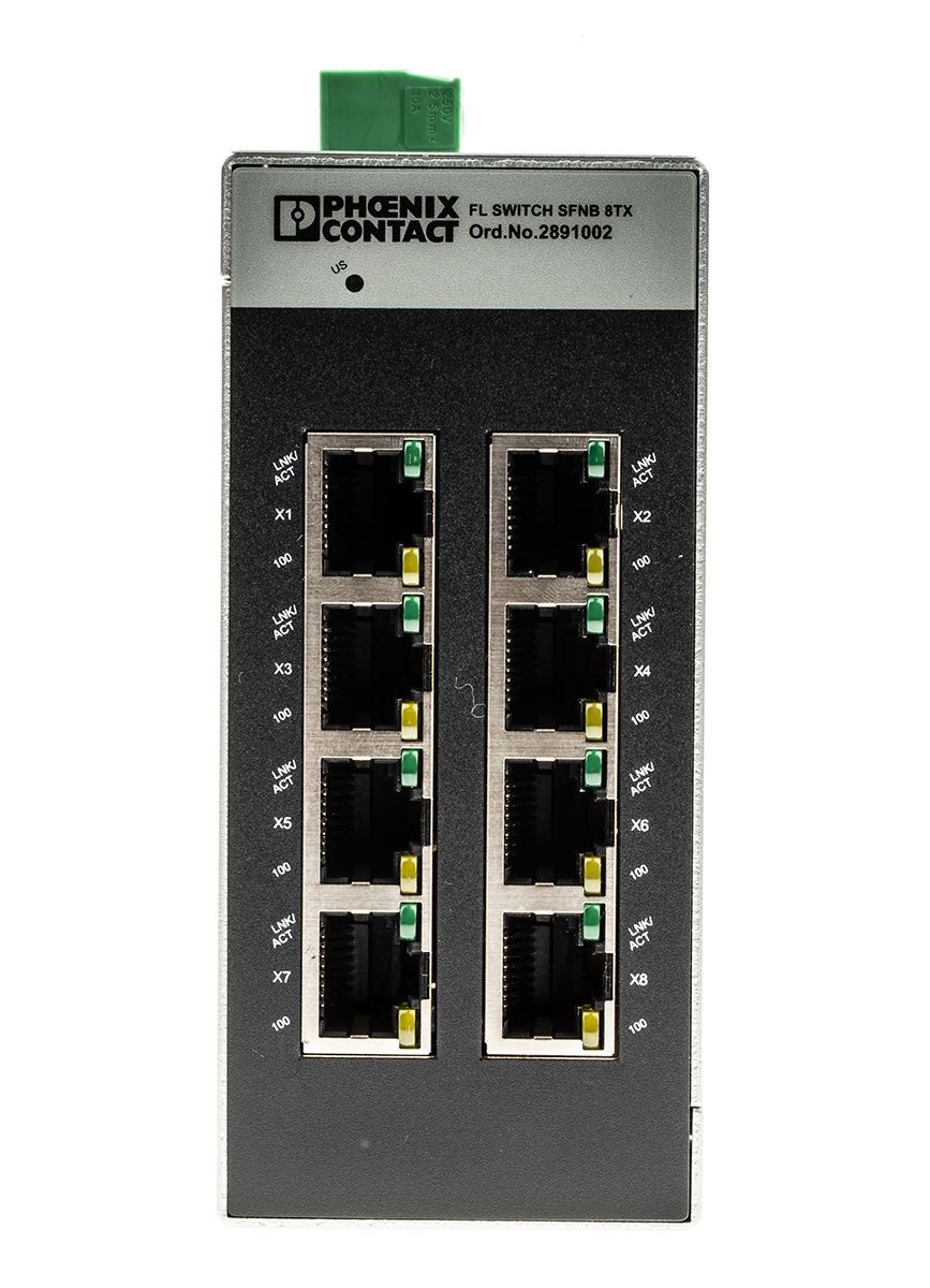 | Product description | Phoenix Contact Ethernet Switch, 8 RJ45 port, 24V dc, 100Mbit/s Transmission Speed, DIN Rail Mount FL SWITCH SFNB 8TX |