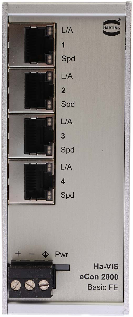 Product description Harting Ethernet Switch, 4 RJ45 port, 28/48V dc, 10 Mbit/s, 100 Mbit/s Transmission Speed, DIN Rail Mount