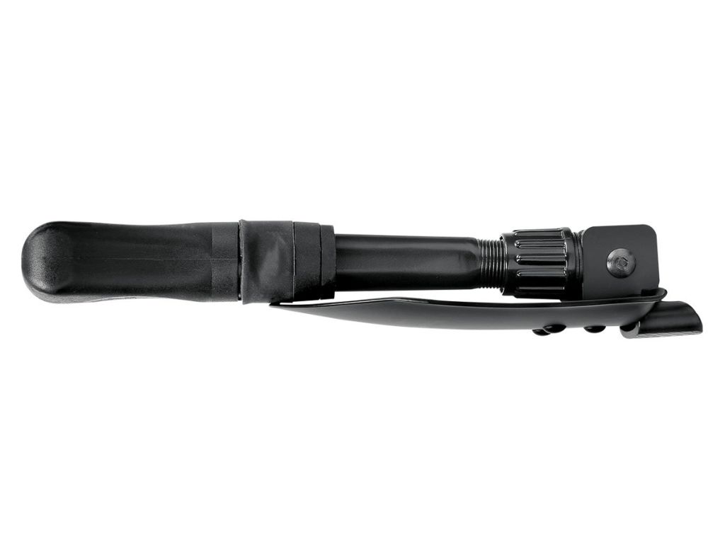 The folding shovel has a fast and smooth push button collapsible handle including a glass filled nylon shaft with a rubberised overgrip. The spade folds back, revealing a textured head that you use as a hammer for pounding in tent stakes. Lightweight and you can store it in the supplied bag.