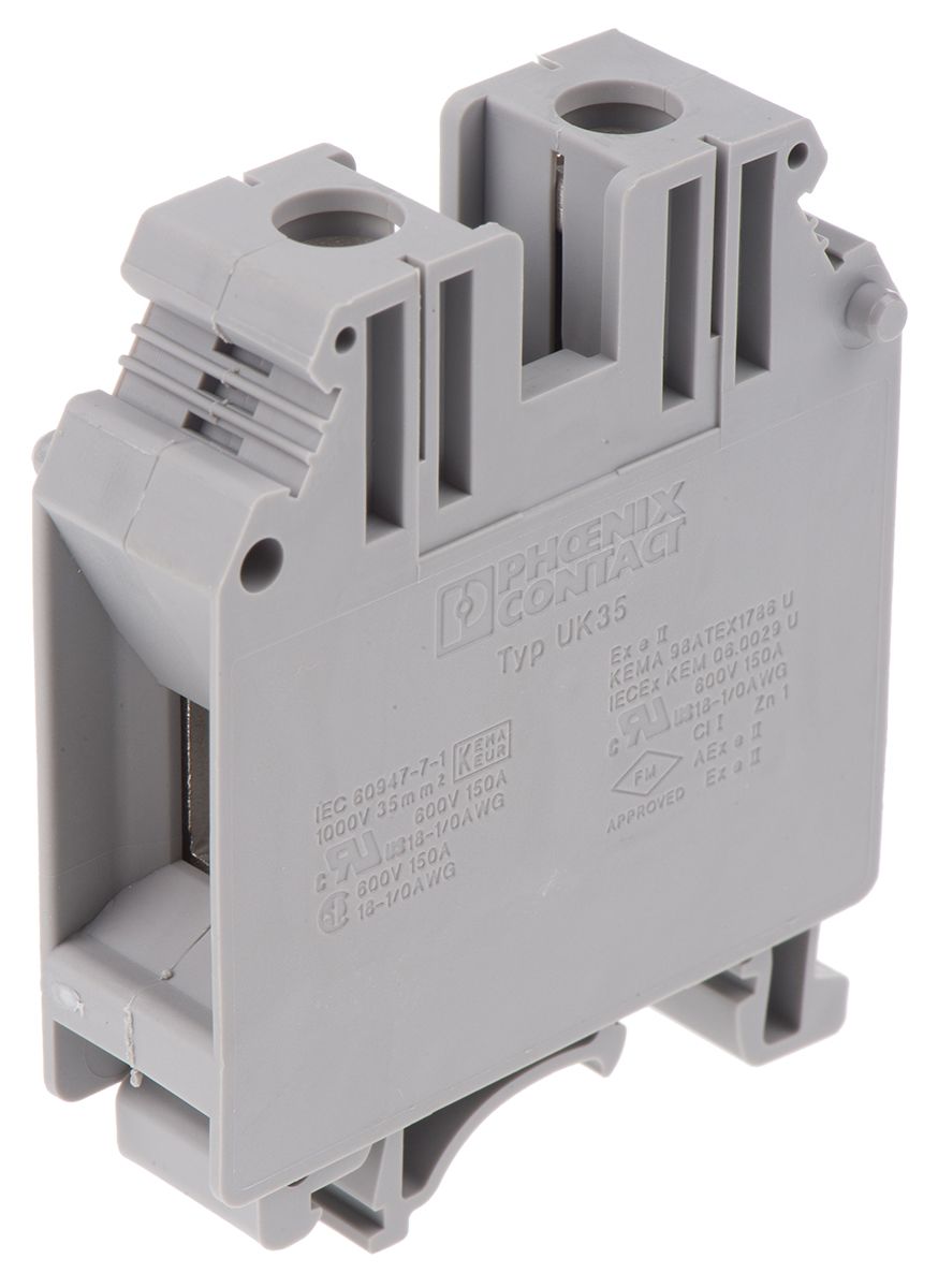 Product description Phoenix Contact Grey UK 35 Standard Din Rail Terminal, 18 - 0 AWG, 0.75 - 35mm², ATEX, 1 kV
