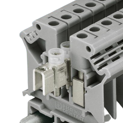 Screw conductor securing with closed screwdriver shafts. Available conductor acceptance sizes, 2.5mm² to 35mm². The range comprises of grey (phase), blue (neutral), and yellow/green (earth) terminals. A 10-way insertion (jumper) bridge is also available, as is a 35mm rail end bracket.