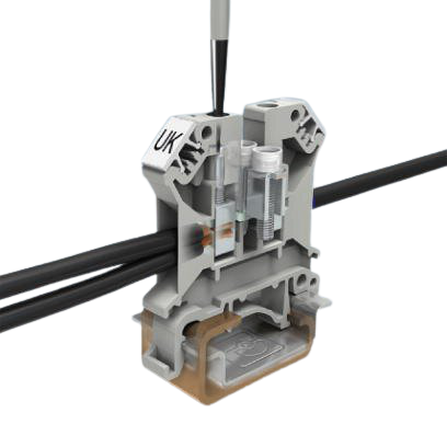 Screw conductor securing with closed screwdriver shafts. Available conductor acceptance sizes, 2.5mm² to 35mm². The range comprises of grey (phase), blue (neutral), and yellow/green (earth) terminals. A 10-way insertion (jumper) bridge is also available, as is a 35mm rail end bracket.