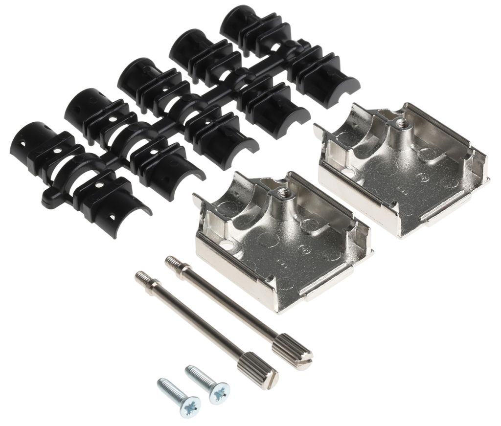 A range of top and side entry d-sub connector hoods or backshells made from metal with knurled screw fastenings. these d-sub connector backshells are supplied with grommet set halves.