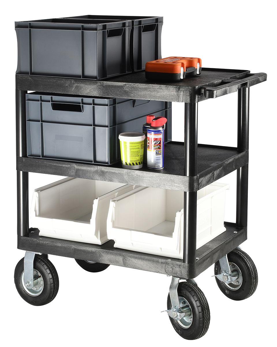 RS Pro Large Utility trolleys and carts are made from recyclable polyethylene (PE) suitable for tough environments. The Trolleys have 3 shelves plus are simple and easy to put together. The trolleys are designed with built-in push and pull handles at one end of the top tray. Swivel rubber cushion pneumatic wheels / tyres ensuring the trolleys are easy to move and transport heavy loads. 2 of the wheels / tyres are braked for added safety when the trolley is stationary.