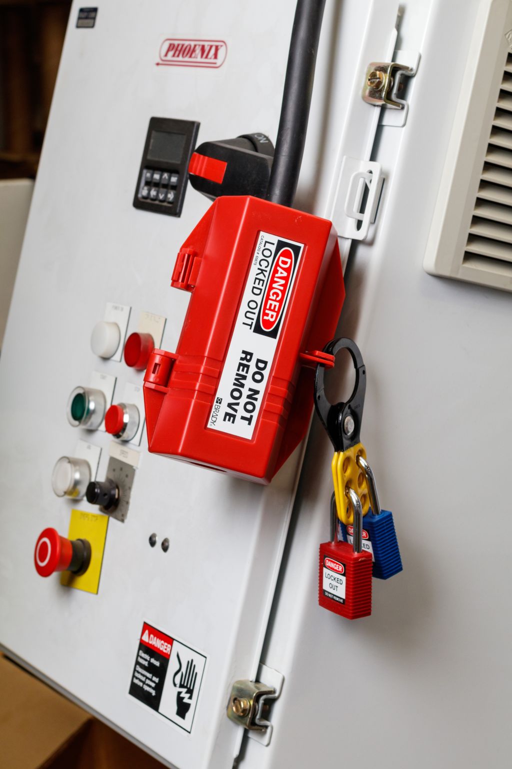 Product description Brady 4 Lock 7mm Shackle PP Plug Lockout- Red