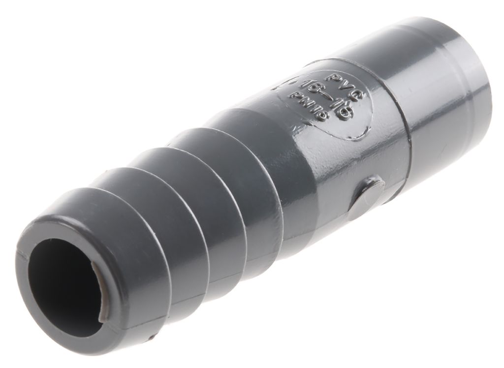Hose connector PVC-U with solvent cement spigot metric and parallel hose connection. Suitable for use in the microelectronics, water treatment, ship building and chemical processing industries